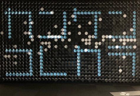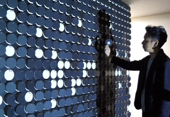 カンケンオフィスの顔となるエントランスウォールを使った映像演出。オープンオフィスを開催するにあたり、映像とセンサーを組み合わせ、来場者のアクションと連動したギミックを施しました。
