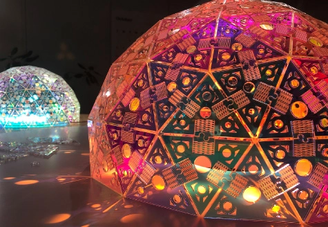 多角形のパズルを「組み合わせる」キラキラカラフルドームは、アクリルにオーロラフィルムを貼り、曲がるような加工を施しており、点光源の照明をドームの下から照らすと、天井面にも七色の仄かな灯りが広がって映し出される演出装置です。