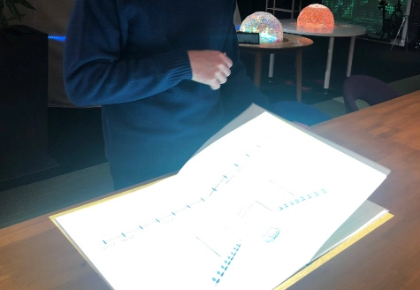 「動く絵本」は、プロジェクションマッピングにページをめくる動きを加えることにより、ワンウェイな説明紹介に能動的な要素を付加したプレゼンテーションコンテンツとなっています。